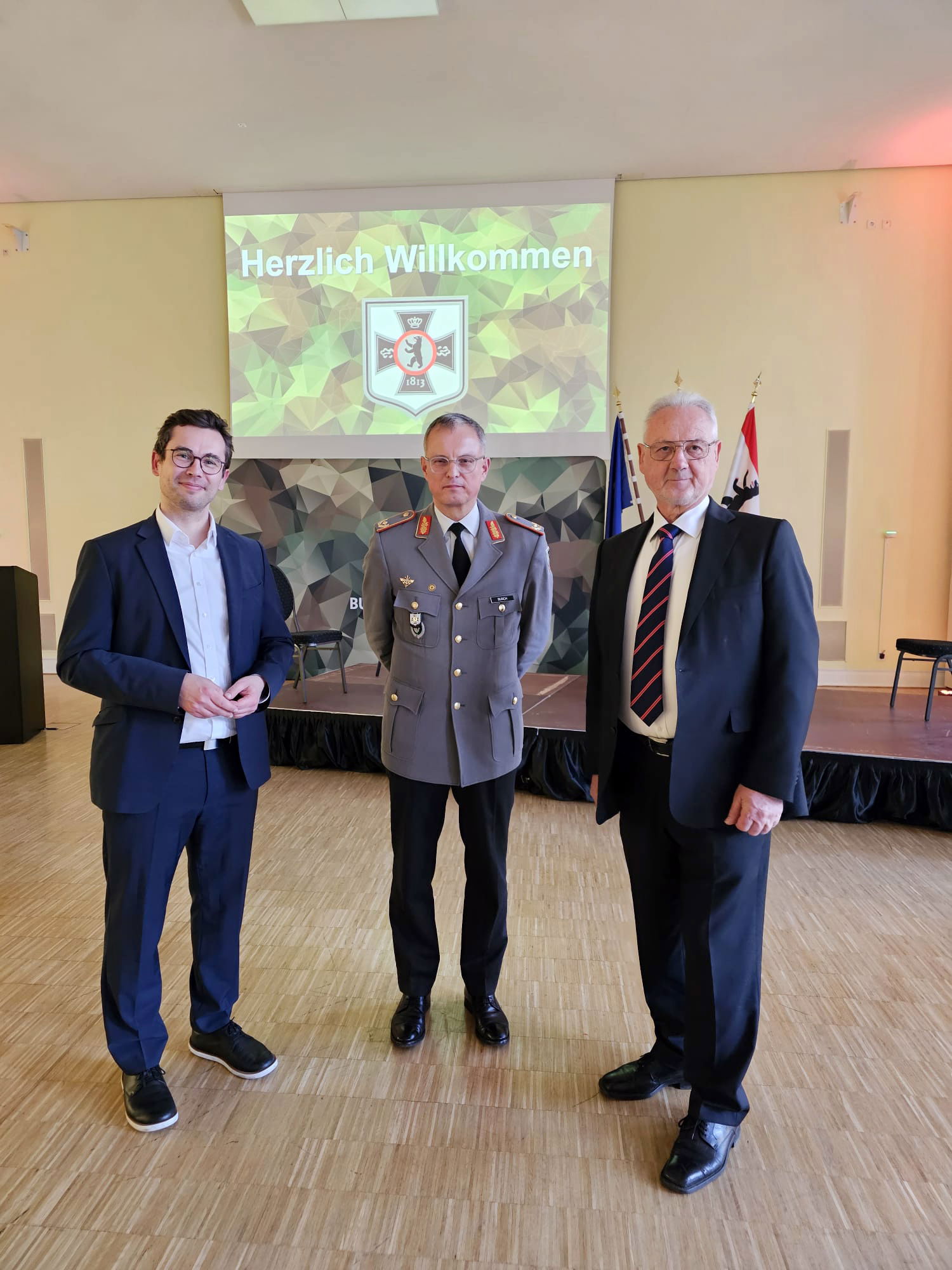 Brigadegeneral Horst Busch, der stellv. ASB-Landesvorsitzende Detlef Kühn (r.) und Landegeschäftsführer Jörg Hinderberger bekräftigen beim Neujahrsempfang der Bundeswehr am 2.2. in der Julius-Leber-Kaserne ihre Zusammenarbeit für einen guten Zivil und Bevölkerungsschutz.