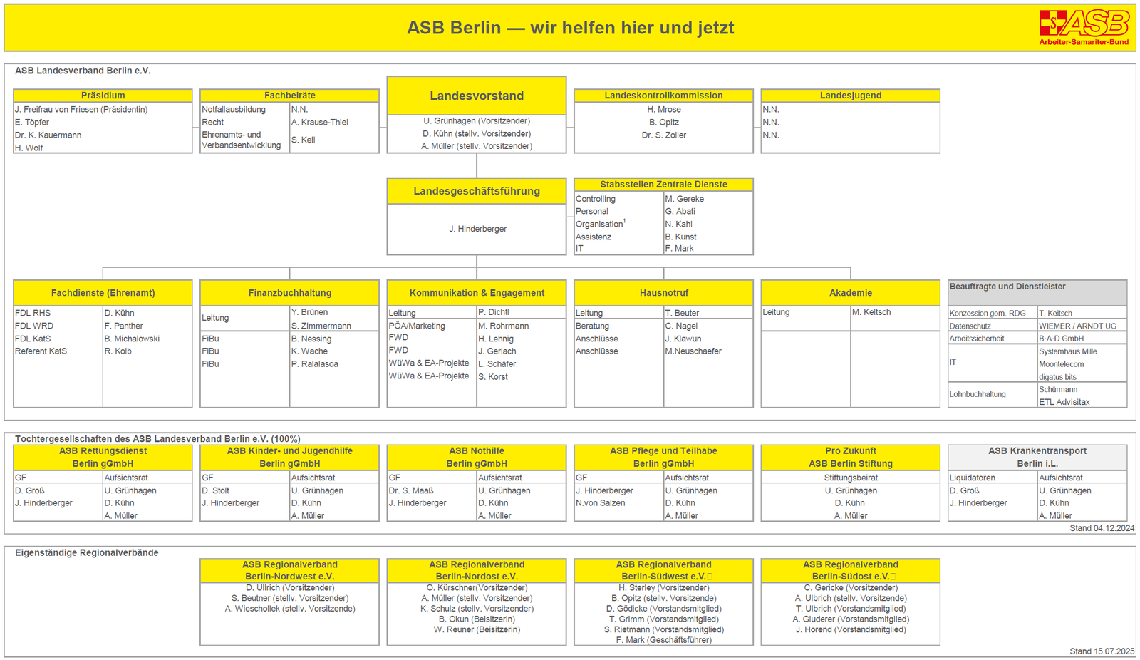 Der ASB Berlin ist föderal aufgebaut: Unter dem Dach des Landesverbandes vereinen sich vier eigenständige Regionalverbände, vier gemeinnützige Gesellschaften und eine Stiftung. Die Landesgeschäftsstelle koordiniert die vielfältigen Angebote – von Rettungsdienst und Pflege über Katastrophenschutz bis hin zu Kitas, Wohnungslosen- und Flüchtlingshilfe.